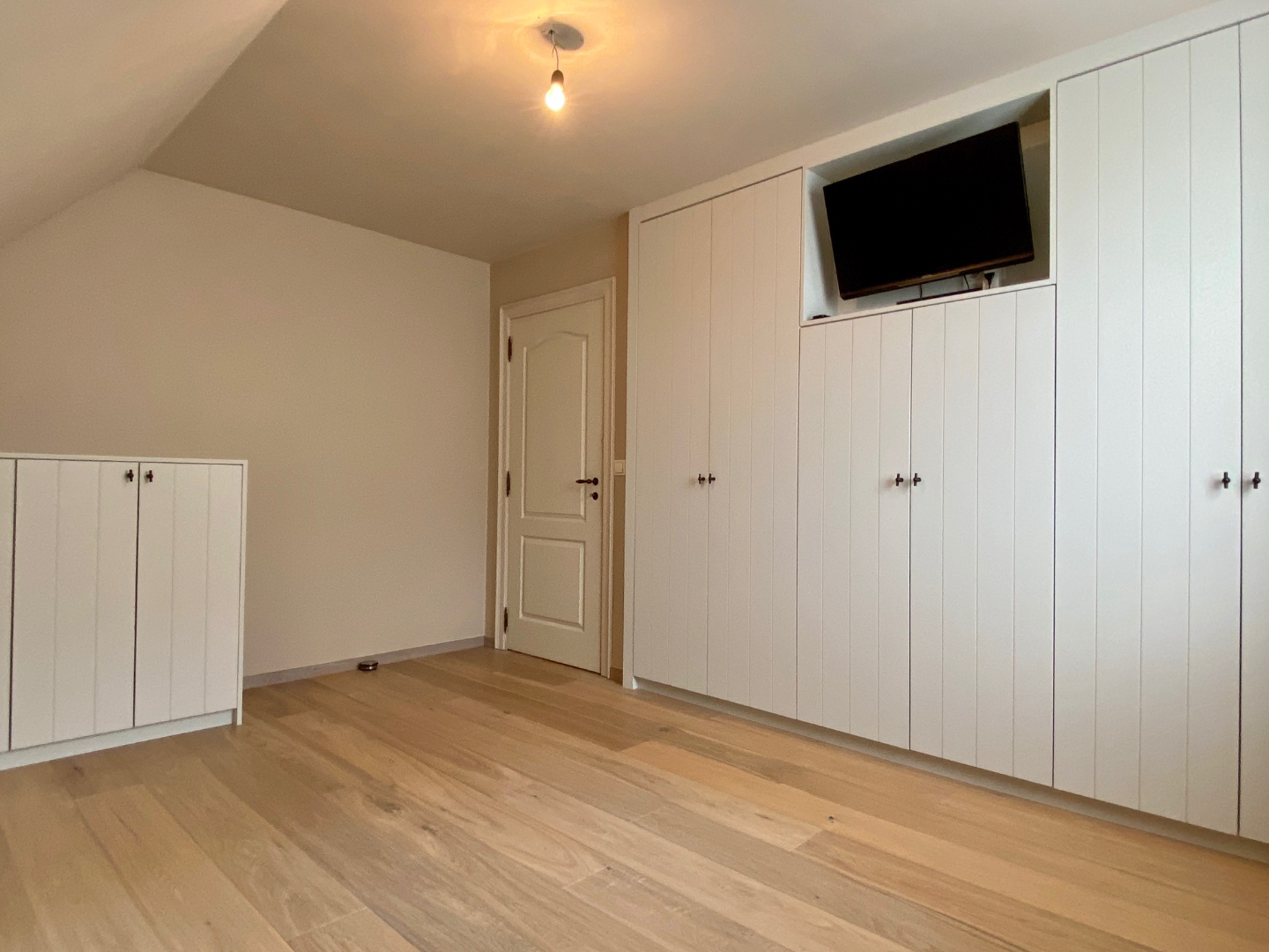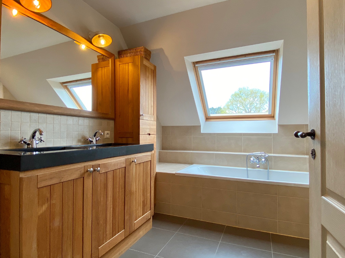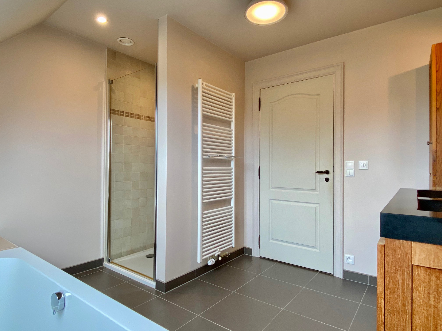 Het verdiep bevat 3 mooie slaapkamers. Maatmeubilair, parket, toilet op de gang, was- en droogkastvoorziening,.. is hier allemaal terug te vinden. Een badkamer met dubbele wastafel, ligbad en douche zijn centraal geplaatst op het verdiep.