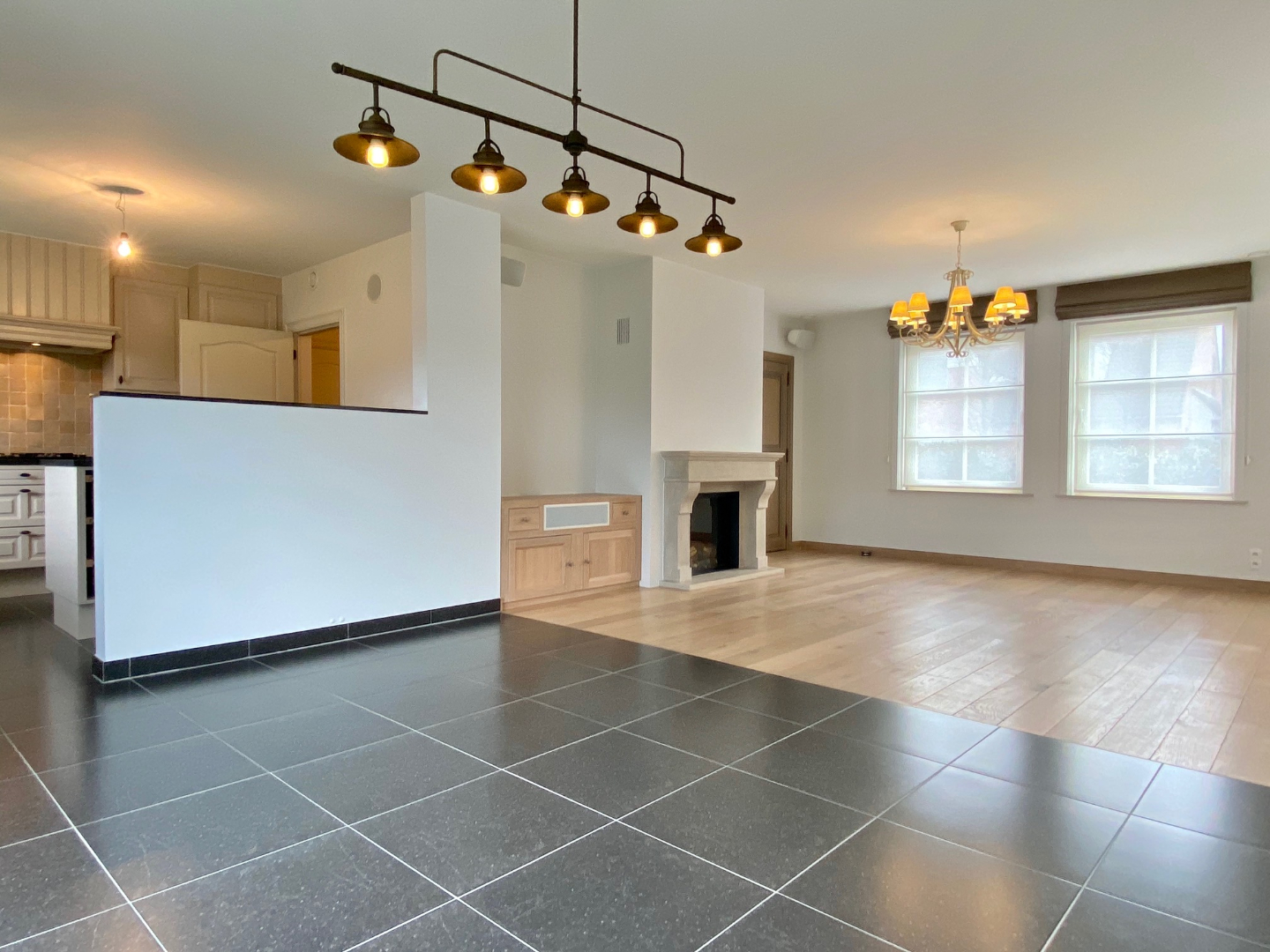 De leefruimte bevat een gashaard en is deels voorzien van tegel en deel van parket. Achteraan, met zicht op tuin en terras is de keuken voorzien. Vele kastruimten, gasfornuis, alle benodigde toestellen en op maat gemaakte eettafel. Aanpalende aan de keuken is er een ruime berging die in contact staat met de garage. Deze is op zijn beurt extra voorzien van maatmeubilair.