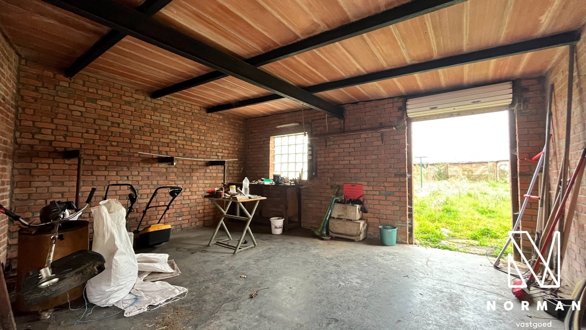 Verder beschikt de woning over twee ruime en afzonderlijk gemetste garages, ruime buitenberging met zolder en een droge kelder. Er ligt geen gas en stadswater in de woning, er is een gemeenschappelijke steenput met de buur.