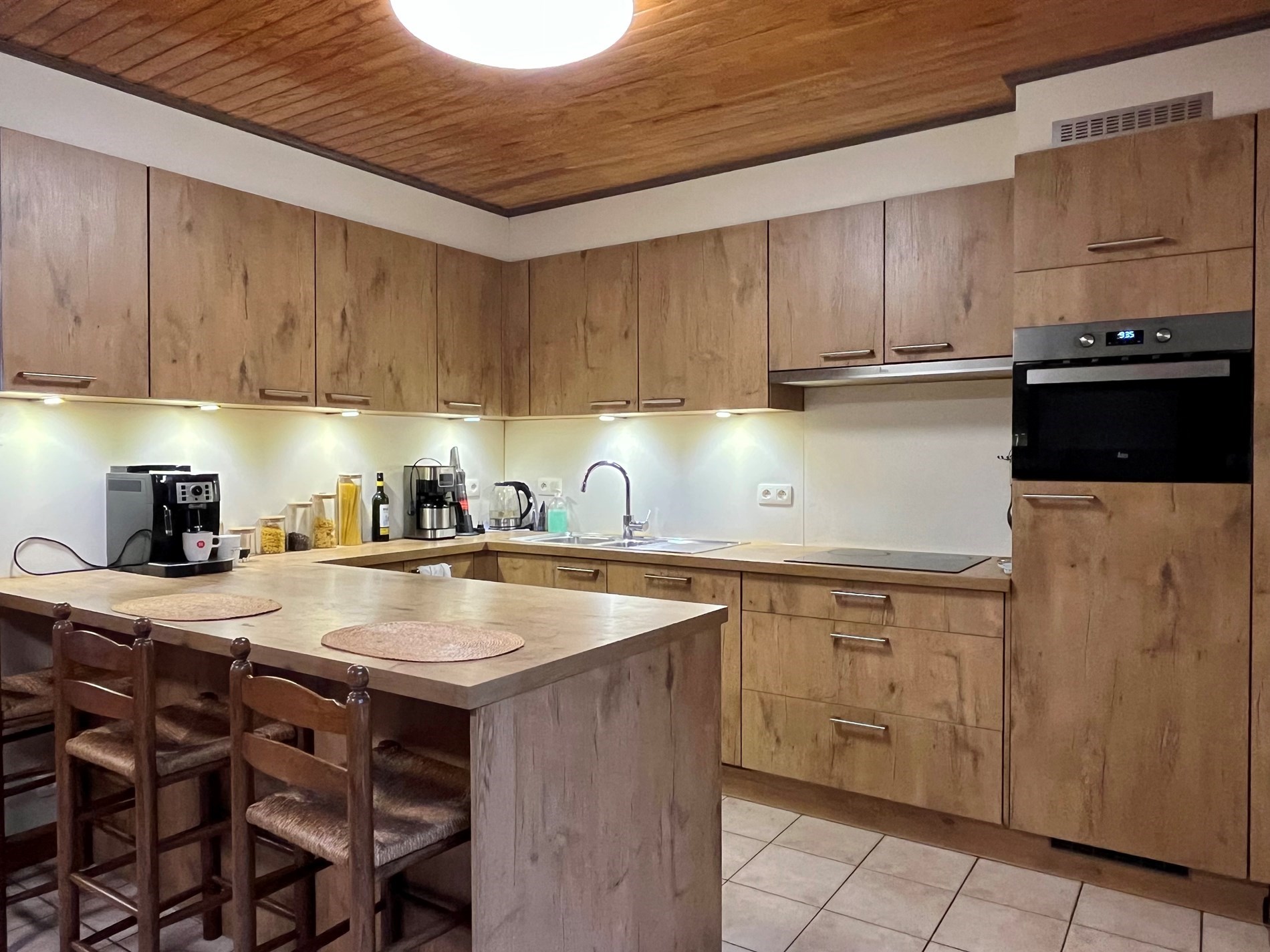 Aansluitend vind je de vernieuwde keuken met een praktisch kookeiland, ideaal om gezellig te ontbijten of samen te koken. Naast de keuken bevindt zich een lichtrijke berging en een handige opslagruimte. In deze ruimte is ook de badkamer te vinden, uitgerust met een toilet, lavabo en douche.