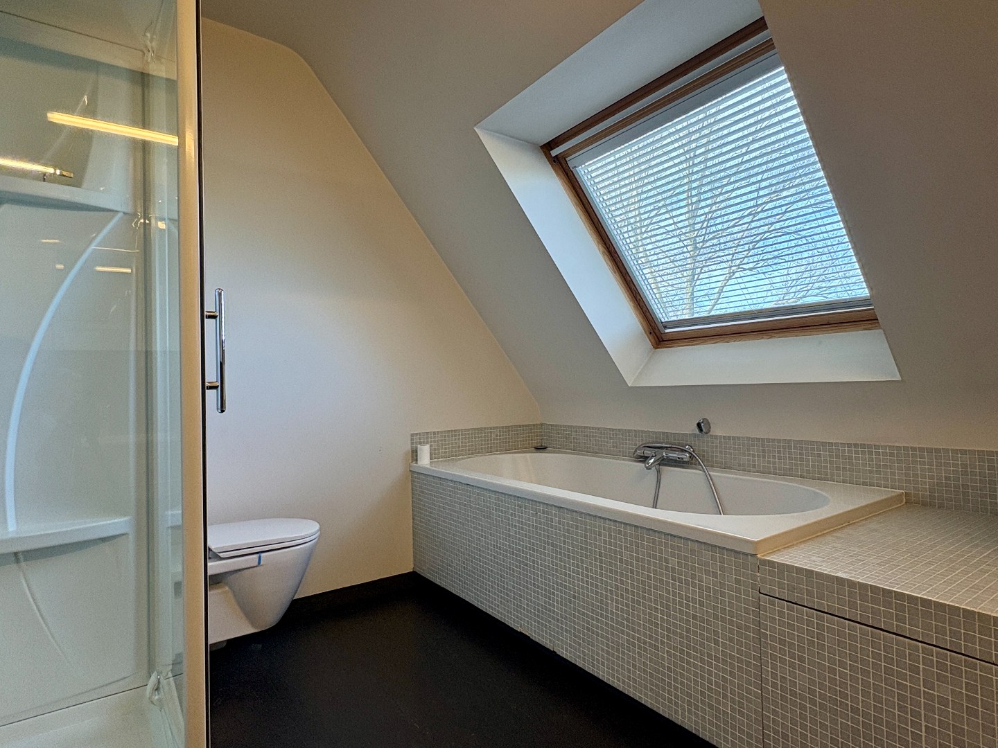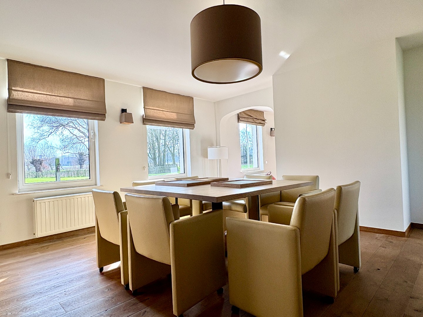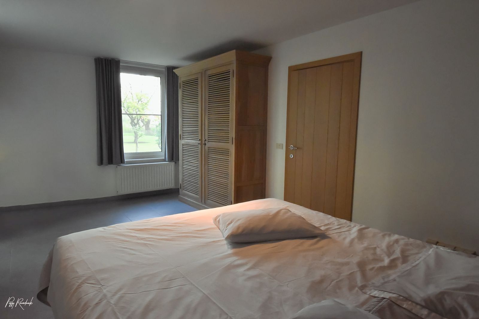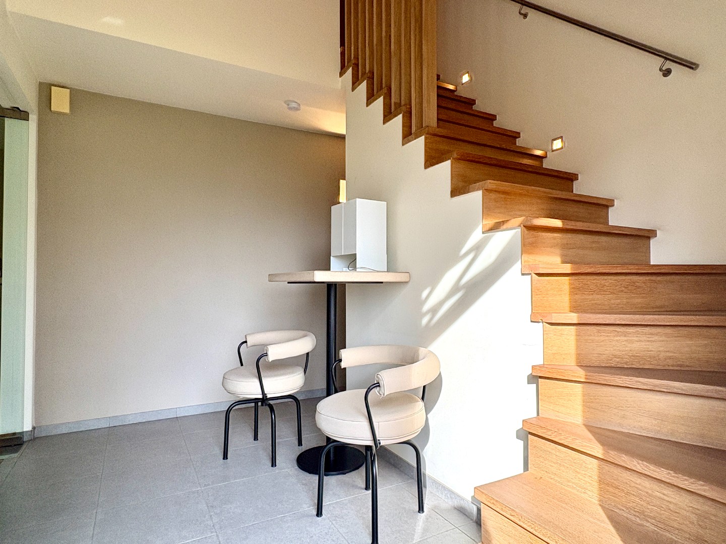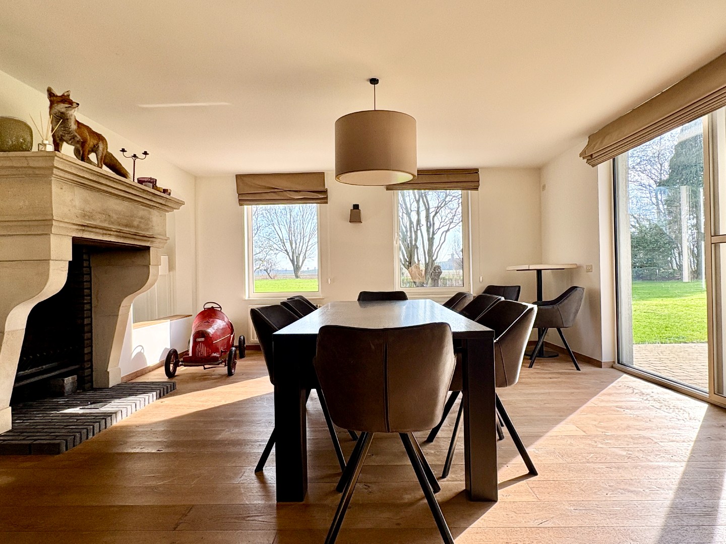 De woonst bestaat uit een statige en ruime inkomhal met open trap. Aan de ene zijde bevindt zich een gelijkvloerse slaapkamer met zicht op de tuin. Aan de andere zijde is er een ruime leefruimte met parket, open haard, grote raampartijen met uitzicht op landelijke vergezichten, maatkasten en toegang tot het terras.