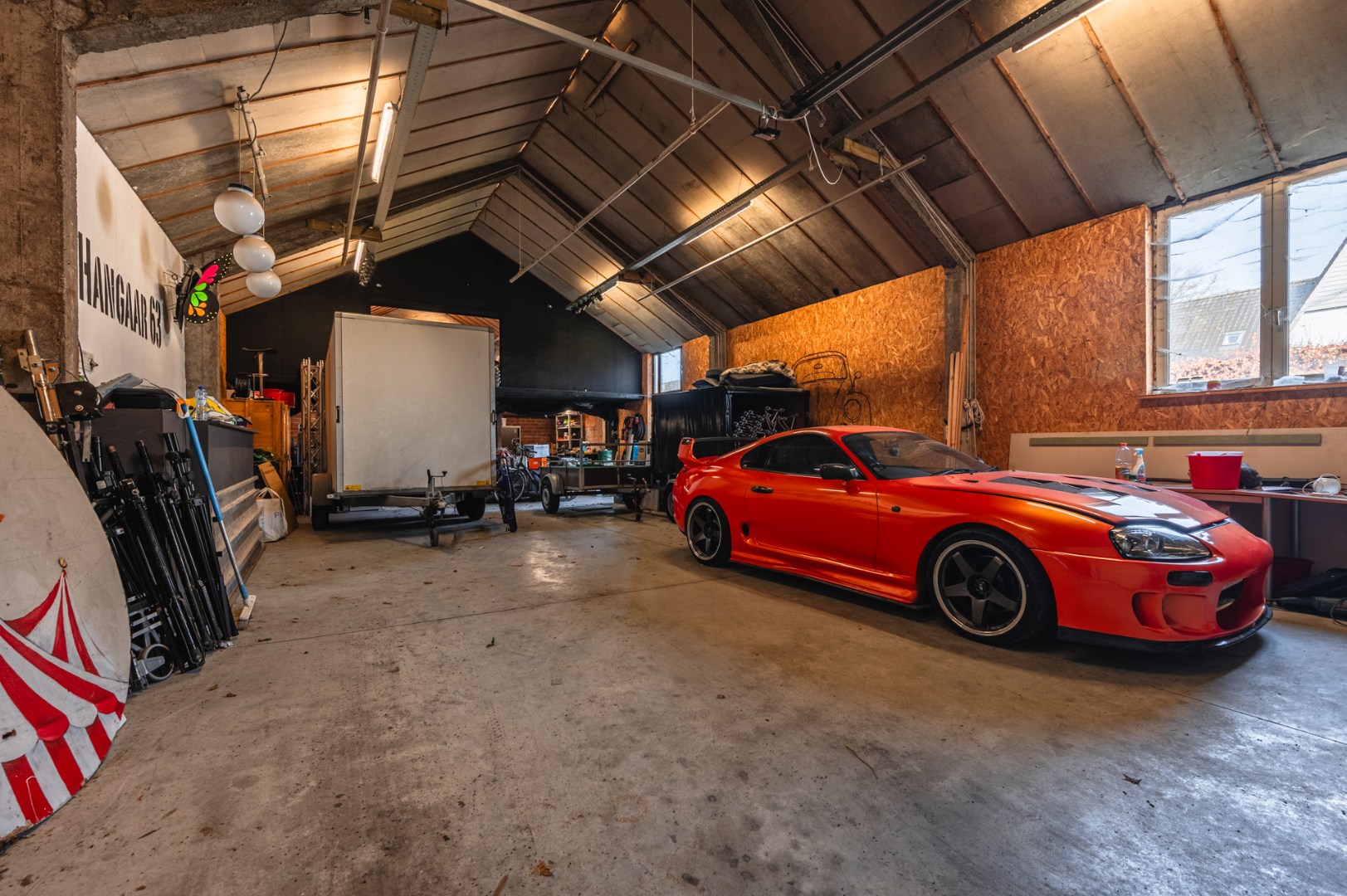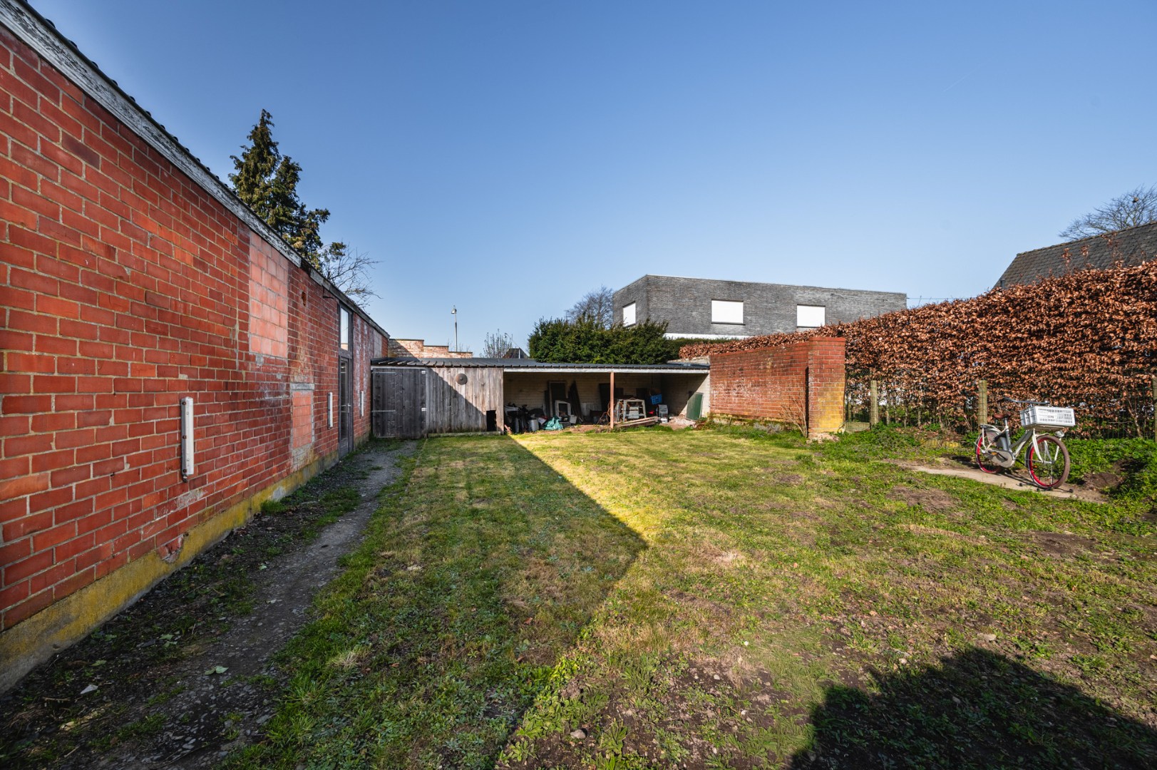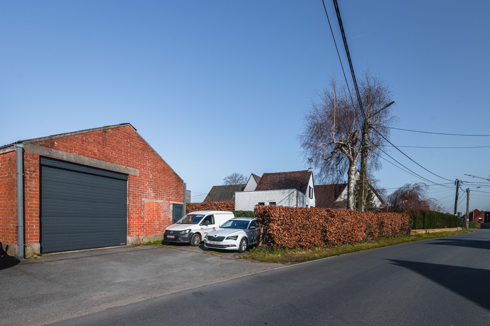 Deze is voorzien van een vlakke betonvloerplaat, hoge poort, zware elektriciteit (3x400v),… Deze is 8.01m breed en 19.01 m diep. Verder heeft deze nog een oprit met parkeerplaats.