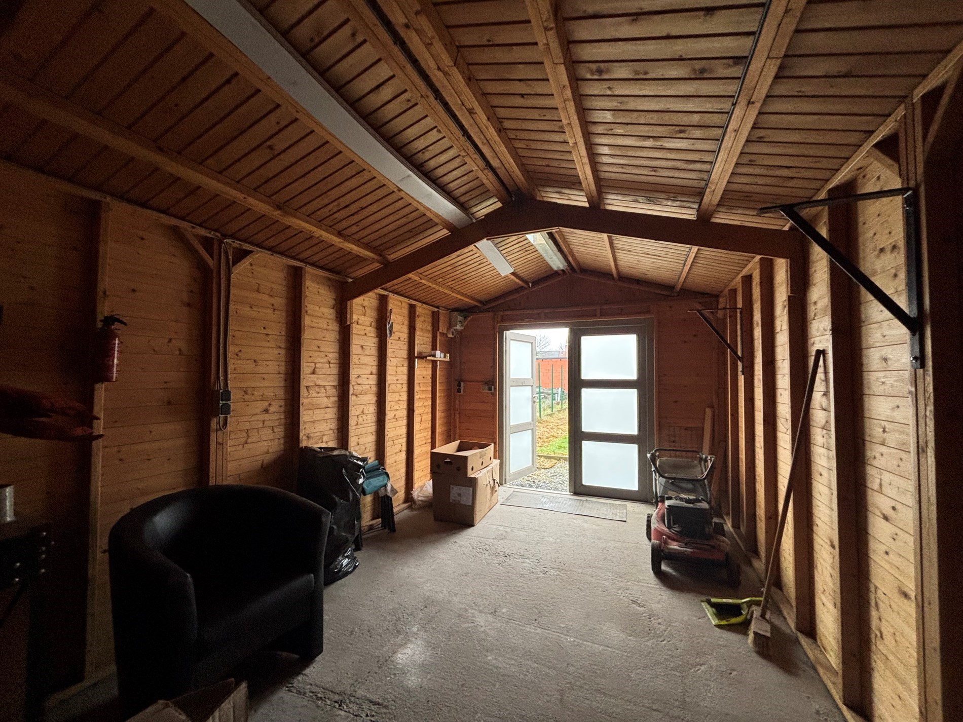Via de keuken kom je terecht in de zuid-gerichte tuin van maar liefst 300m². Deze beschikt over een tuinhuis dat kan omgebouwd worden tot garage. Achter het tuinhuis ligt er een heel ruime oprit die plaats biedt aan 3 tot 4 wagens.