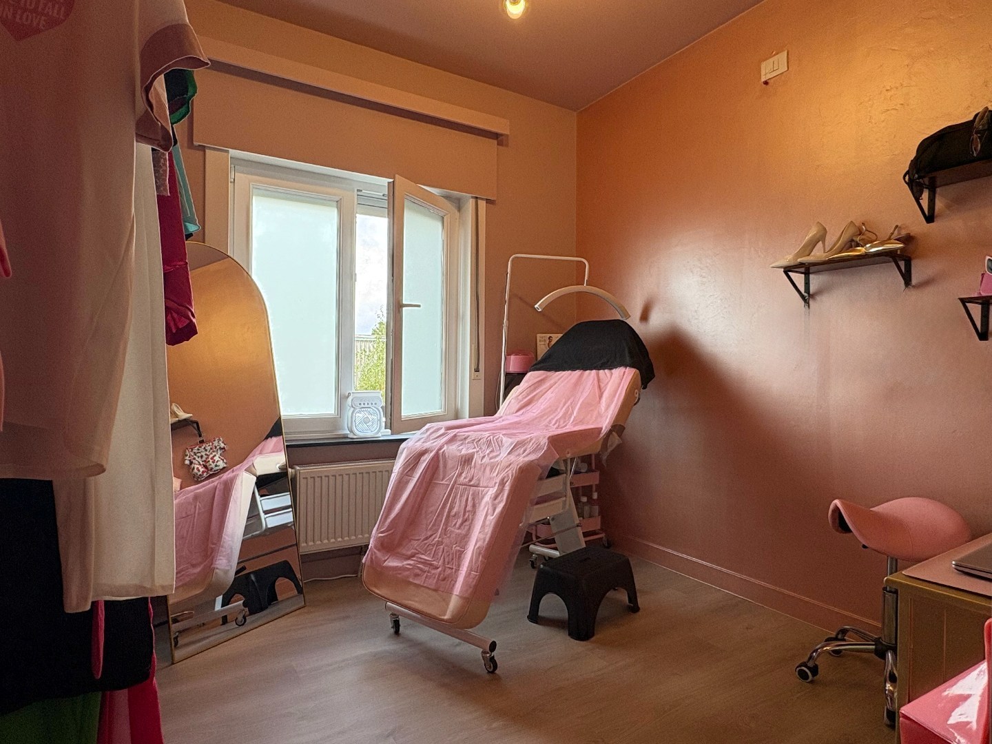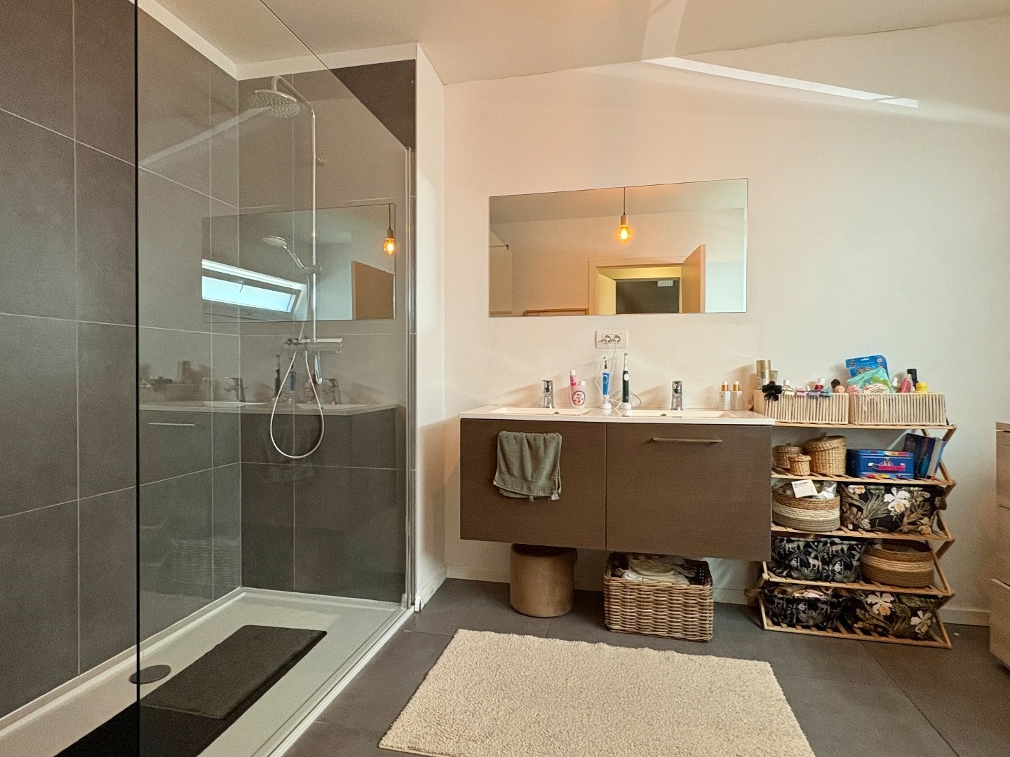 De zuidgerichte tuin is een grote troef. Op het gelijkvloers vind je verder een ruime badkamer met douche, dubbele wastafel en ligbad, evenals een apart toilet.