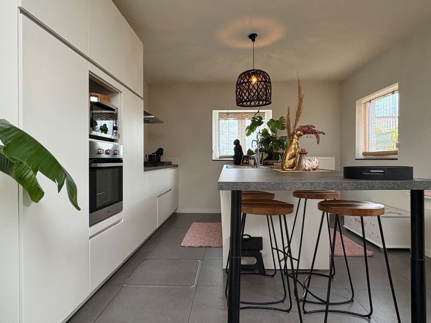 Bij het binnenkomen van de woning betreed je de lichtrijke leefruimte met uitzicht op de tuin. Aansluitend bevindt zich de moderne, volledig uitgeruste keuken met keukeneiland. Vanuit de keuken heb je toegang tot een praktische berging met aansluiting voor de wasmachine en extra opslagruimte. Daarnaast beschikt de woning over een kelder en een handige zijdoorgang langs de linkerkant, ideaal voor het plaatsen van fietsen.
