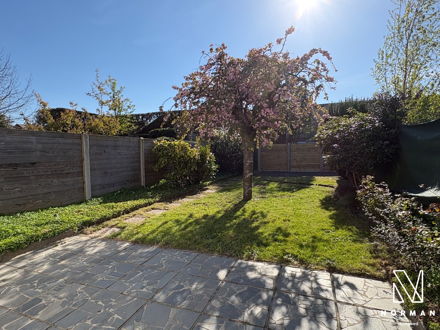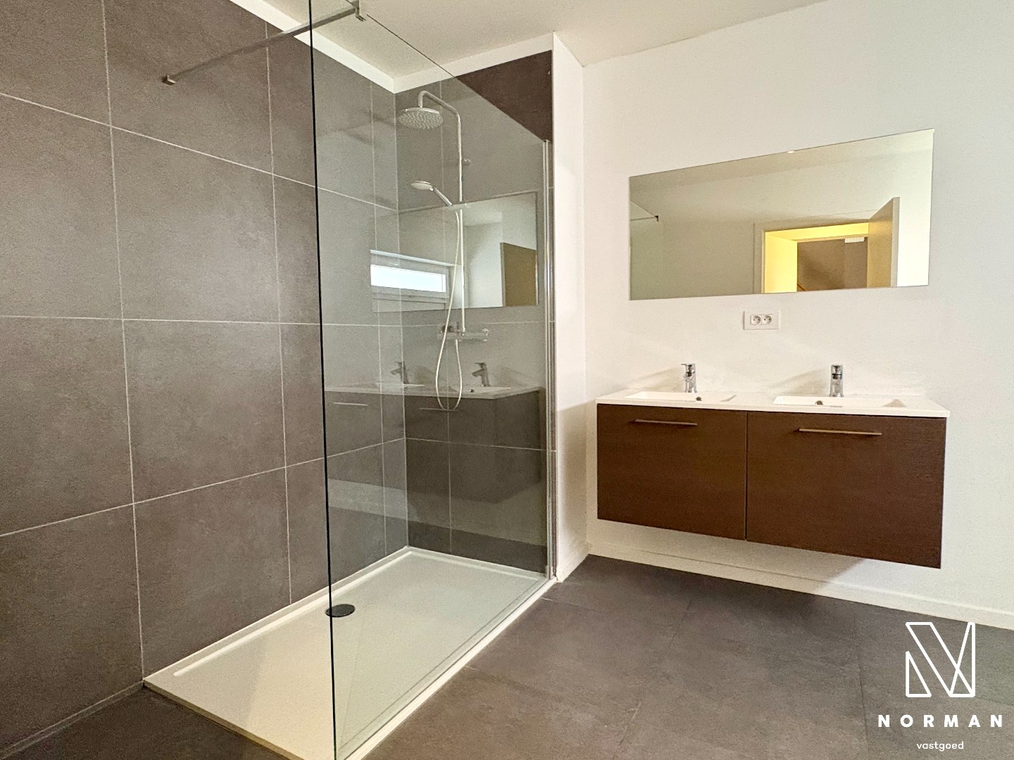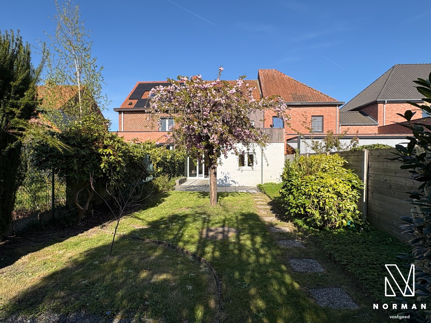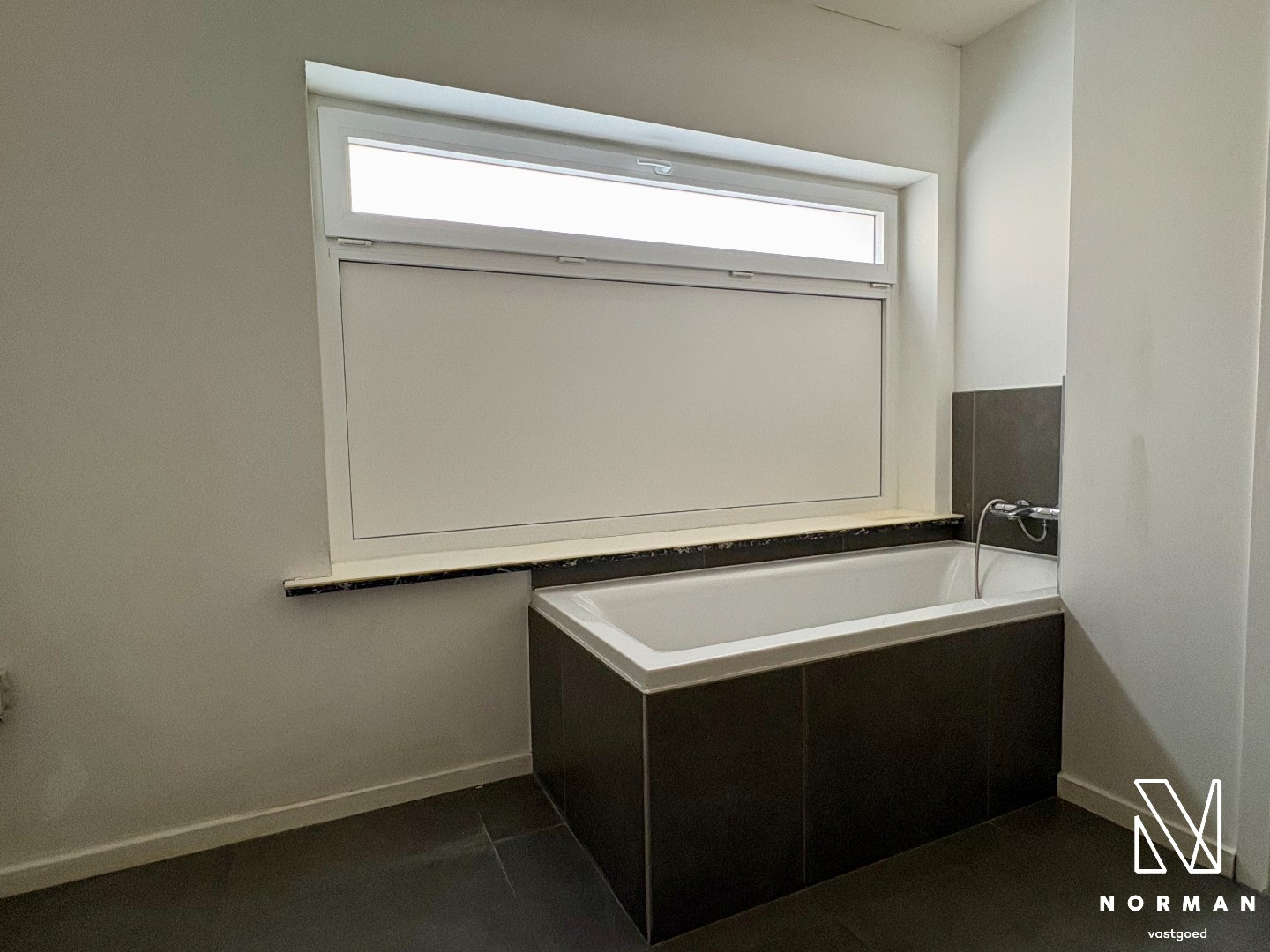 De zuidgerichte tuin is een grote troef. Op het gelijkvloers vind je verder een ruime badkamer met douche, dubbele wastafel en ligbad, evenals een apart toilet.