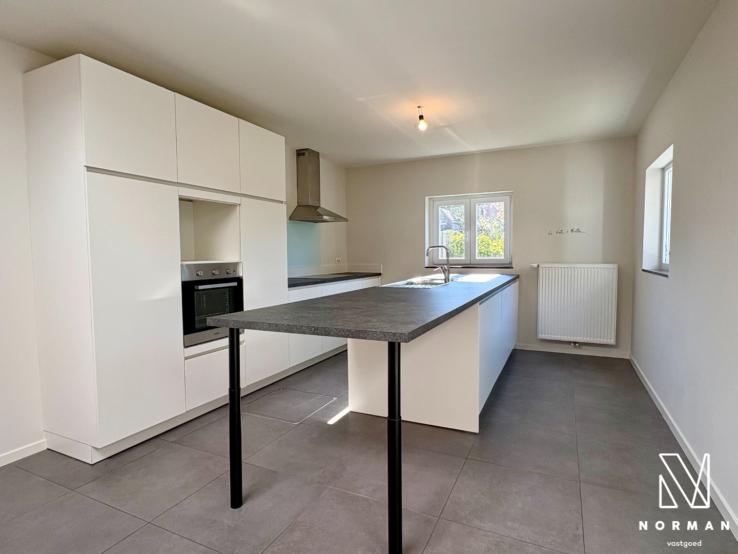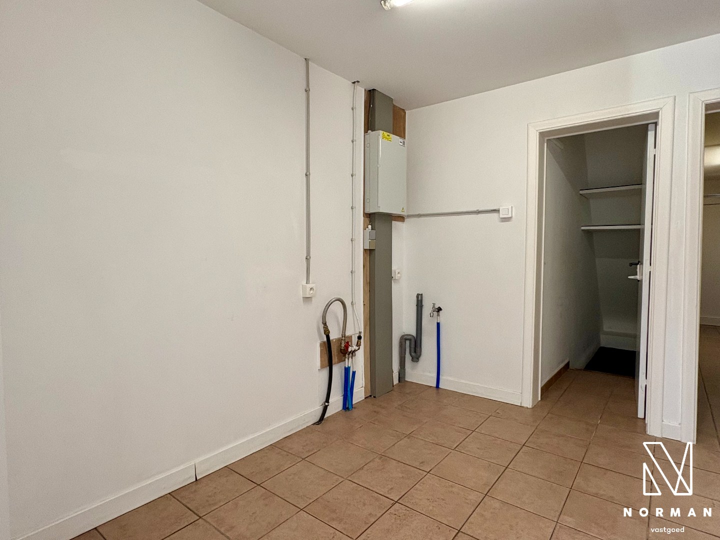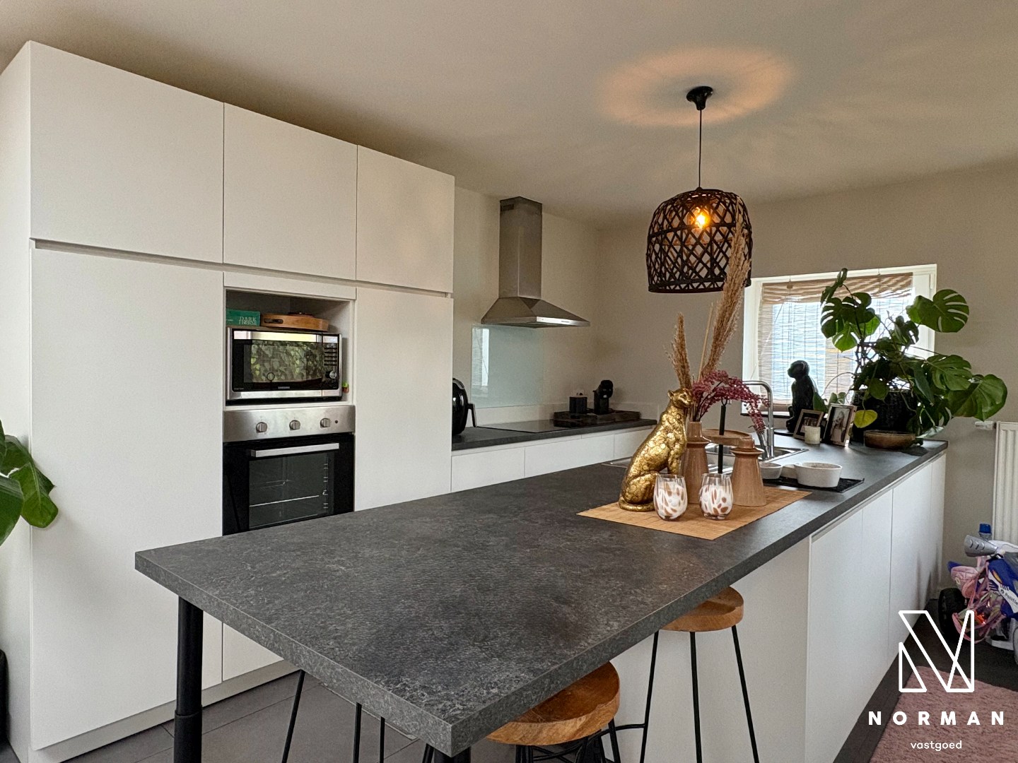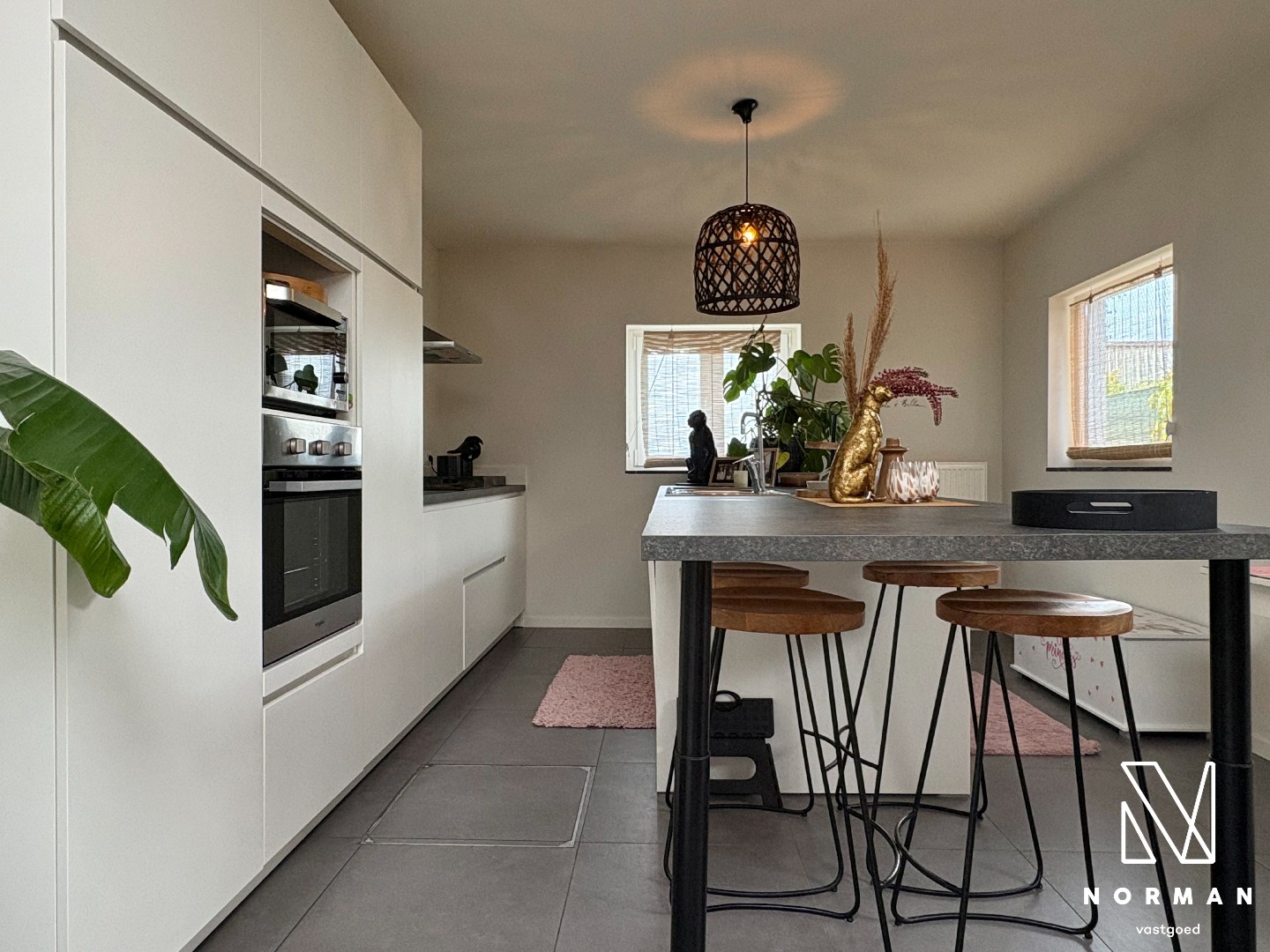 Bij het binnenkomen van de woning betreed je de lichtrijke leefruimte met uitzicht op de tuin. Aansluitend bevindt zich de moderne, volledig uitgeruste keuken met keukeneiland. Vanuit de keuken heb je toegang tot een praktische berging met aansluiting voor de wasmachine en extra opslagruimte. Daarnaast beschikt de woning over een kelder en een handige zijdoorgang langs de linkerkant, ideaal voor het plaatsen van fietsen.